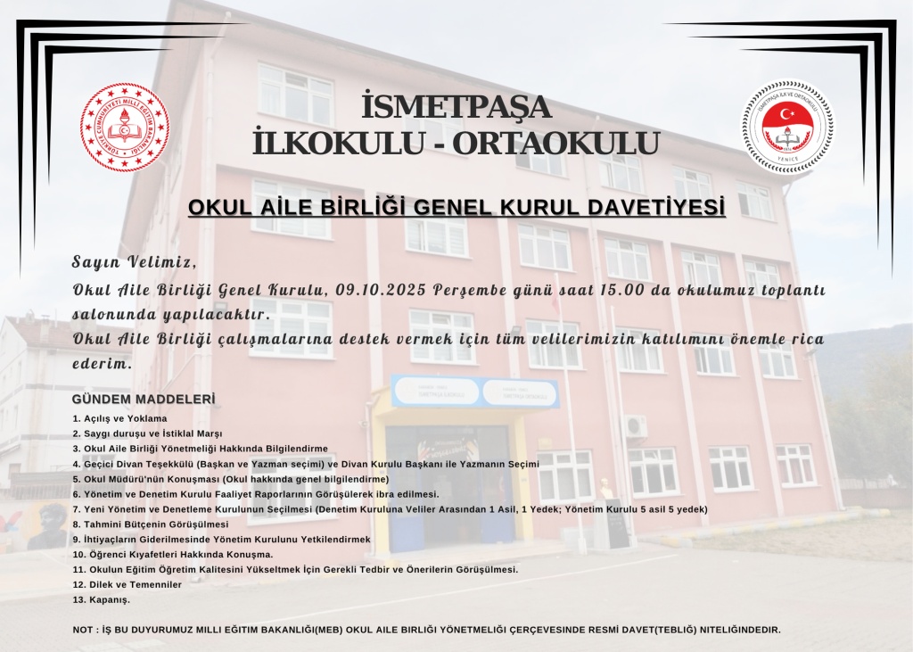 Not : İş bu duyurumuz Milli Eğitim Bakanlığı(MEB) Okul Aile Birliği Yönetmeliği çerçevesinde RESMİ DAVET(tebliğ) niteliğindedir.